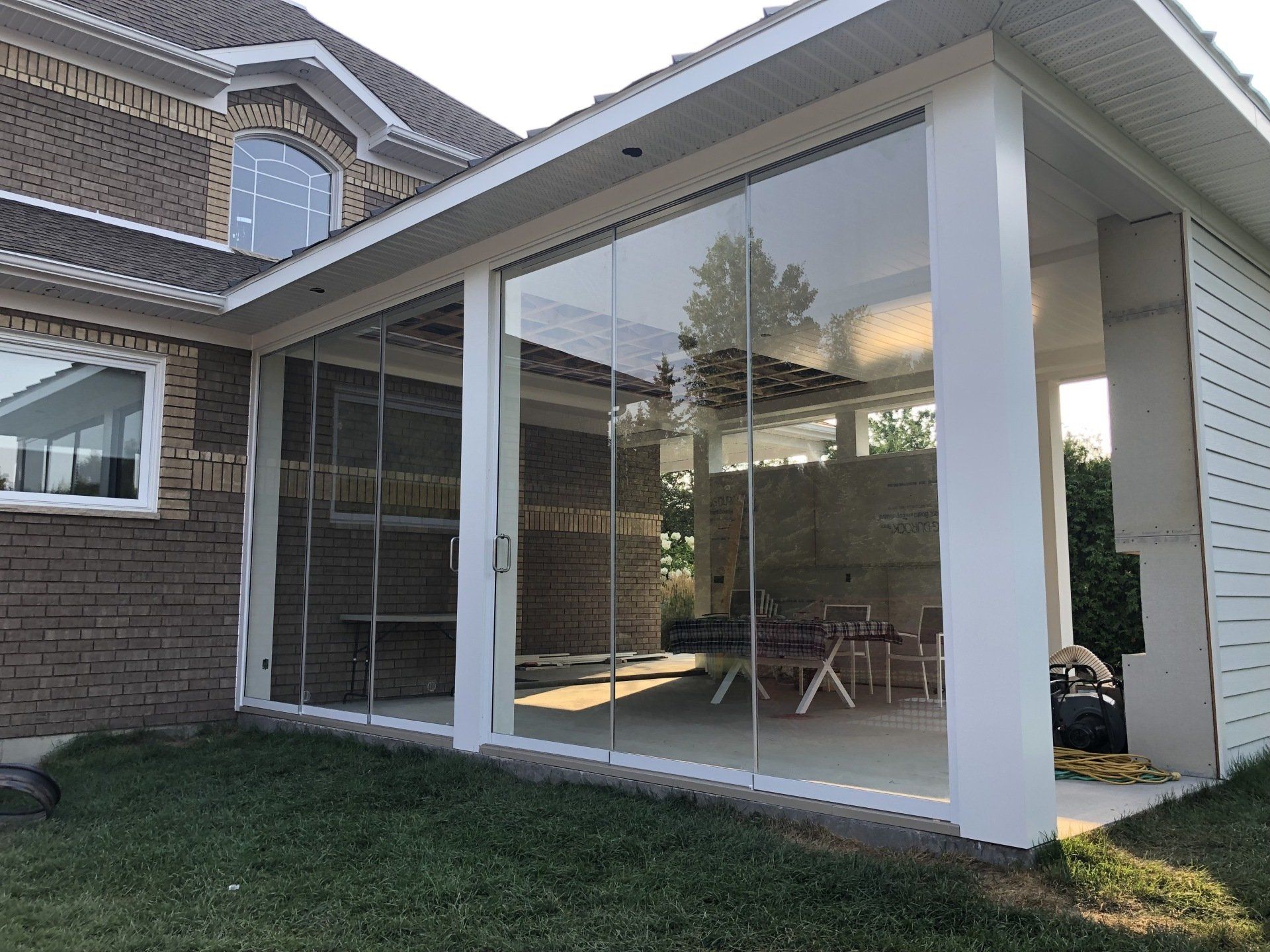 est un système exclusif sans profilé verticaux qui offre une vue incomparable. Conçu avec du verre trempé de 10 mm et des rail en aluminium de seulement 5/8" de haut, cette porte offre une durabilité surprenante. Idéale pour vous mettre à l'abris sans rien enlever à la vue de votre patio. La porte Full Vision Coulissant Adstock permet des ouvertures impressionnantes avec son système de rail multiple.